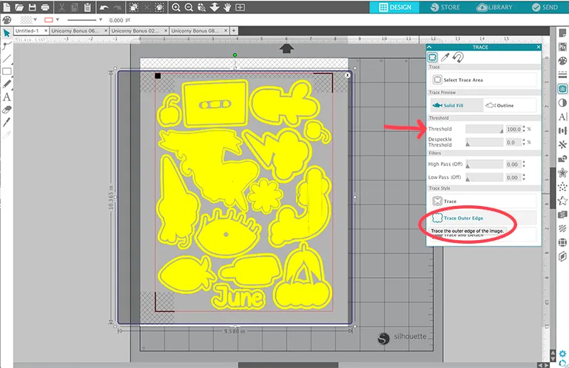 - After you have your designs all placed, it’s time to create a cut line around the edges of each of your designs. To do this, open the trace window and click select trace area. Then drag to create a rectangle around all of your designs. Next, adjust the threshold setting until the design is completely yellow. Finally, click “Trace Outer Edge” to create cut lines around the edge of each shape. A red line should appear around the edge of each of your designs where the Silhouette will cut.
