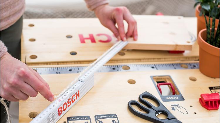 Now you can saw the plank, which is still fixed firmly to your work surface, into four separate pieces – along the lines you drew earlier. To do this, you can use either a jigsaw or cordless circular saw. We opted for the latter, and would recommend you do too.