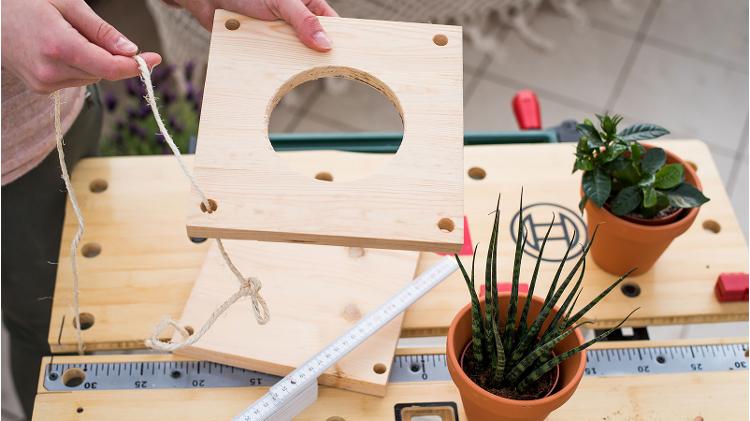 The panels that the plant pots sit in will be suspended using four pieces of rope. You’ve already sawn four holes, one in each panel corner, for this. Now you need to cut four pieces of rope of equal length. The length is up to you: base your measurement on the height of your ceiling, and how low you want your plant hanger to hang.