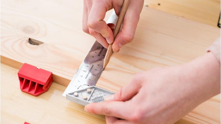 Your beautiful plant hanger consists of four levels floating one above the other. This means you need to cut the plank into four separate pieces. We’ll get to the sawing part later; for now we’re just going to divide the plank up. You need to draw three straight lines on the plank: place the ruler on the plank with the shortest side facing you and, with the triangle, draw the first horizontal line 20 cm in. Then measure another 20 cm from that line and mark that with your pencil, followed by the third line. Now your plank should be divided up into four sections.