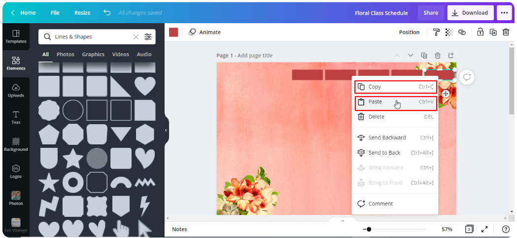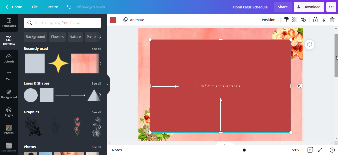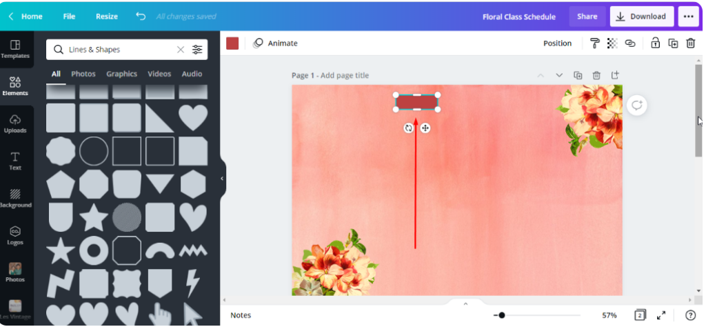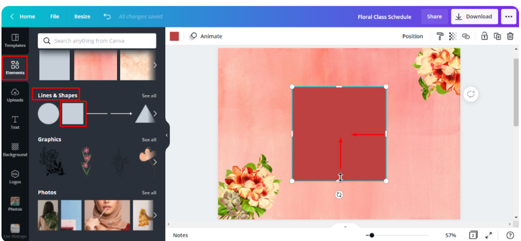 From the editor panel on the left, Click Elements > Lines & Shapes and choose Square. Your shape will now appear in your design. You can adjust the shape to change it to a rectangle. Do this by clicking the white handle on the middle and drag it in to decrease its width and height.