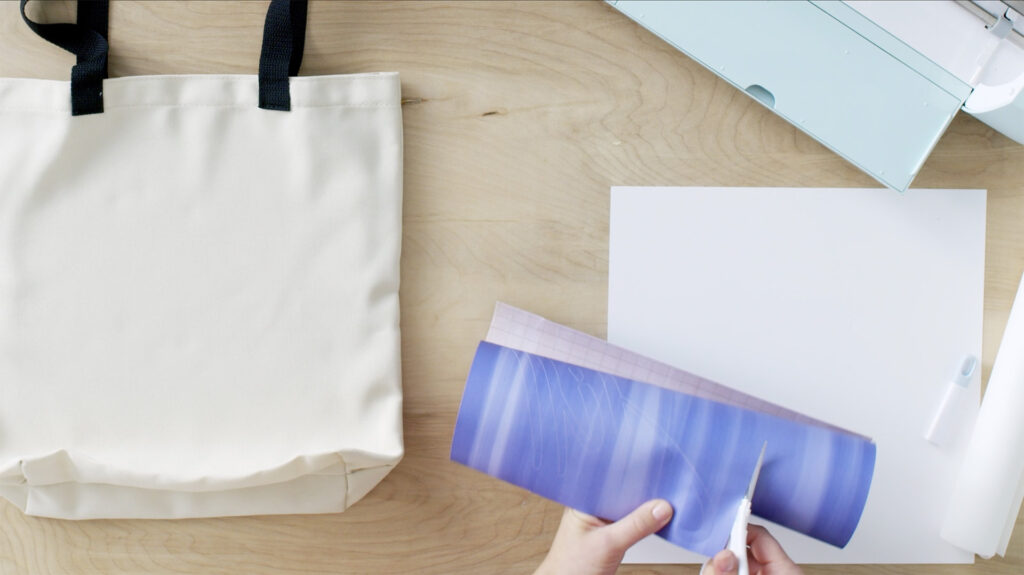 - Lay your tote bag over the Cricut EasyPress Mat. To ensure your design doesn’t bleed through the tote material, insert a sheet of cardstock inside the tote bag blank. Place the sheet of butcher paper over the design and you’re ready to press!