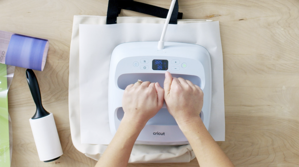 - Use the Cricut Heat App to send heat settings to your EasyPress. For Infusible Ink on a tote bag base, the heat settings will be 385°F for 40 seconds.