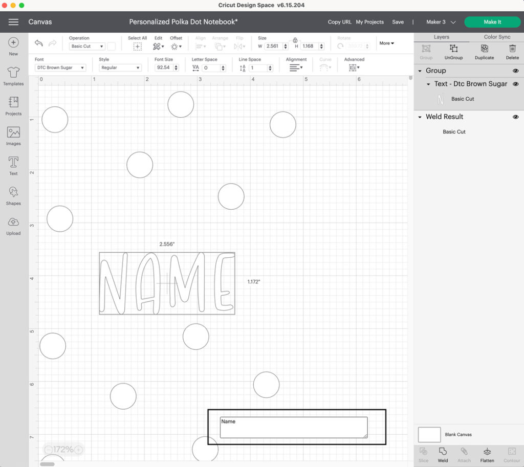Click on the text box that says “name.” Another box should open. Click into that field and type your name. Center the text back on the polka dot design. If your notebook or journal isn’t 5” x 7” use the resize arrow on the bottom right of the images to adjust!