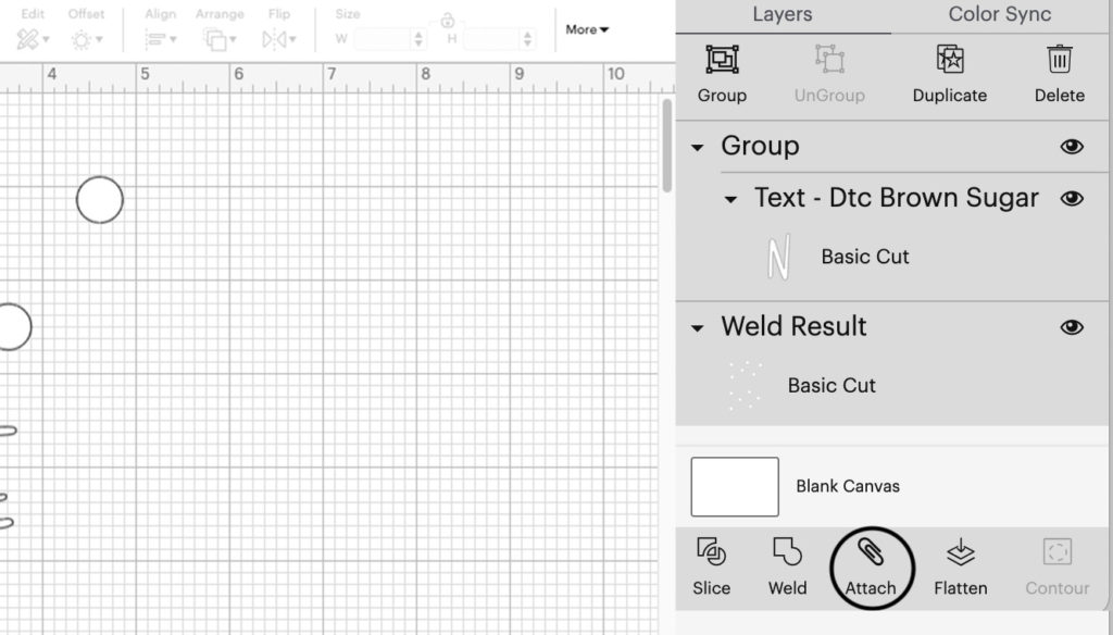 Once your design is ready to cut, select everything and click “attach,” this will indicate to the machine that you want everything to cut exactly as it looks on the canvas.