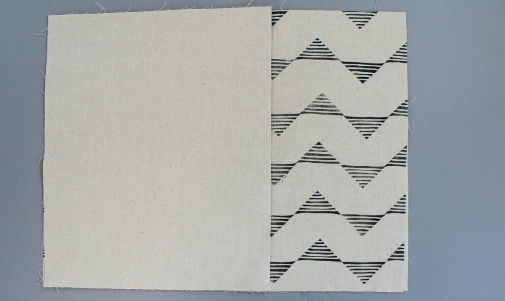 - Place the rectangles in the following order: The light color fabric rectangle, the printed fabric (right side up), and then both folded back pieces overlapping on top. The folded edges with topstitching should be overlapping — this will create the “envelope” opening on the back of the pillow.