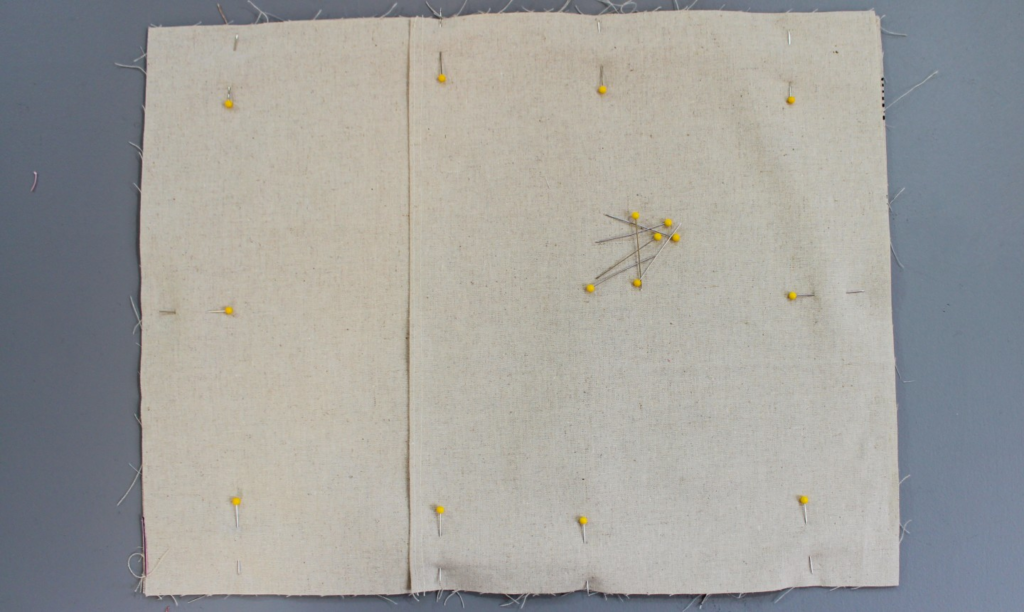 - Once everything is laid out, pin all the fabric together along the outside edge of the rectangle. Stitch around the pillow’s edges with a ¼” seam allowance.