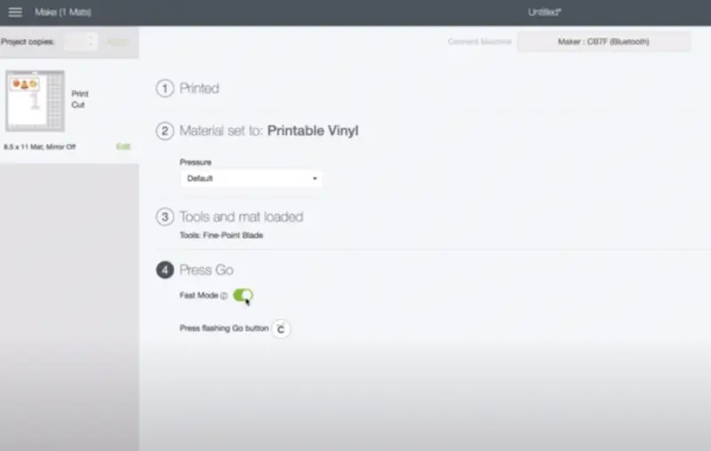 - Load the mat with the printed vinyl into the Cricut. Double-check you have the fine point blade equipped in your machine.