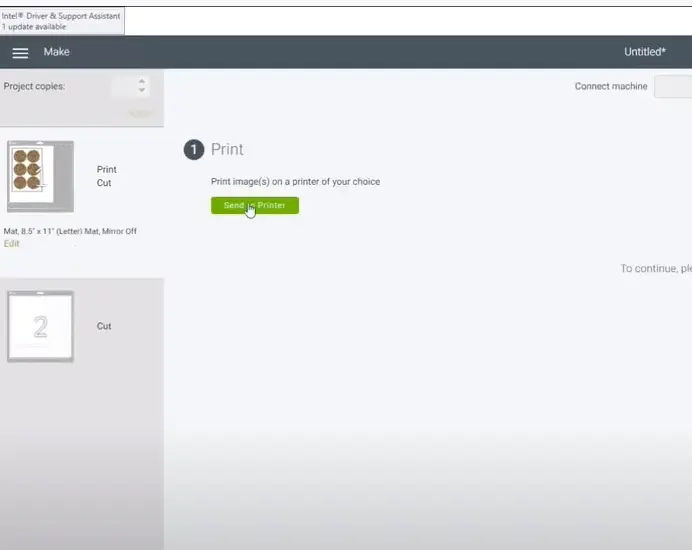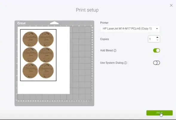 - Once the vinyl is loaded properly, go back to the screen. Make sure ‘Bleed’ is on, and then click on the print button.